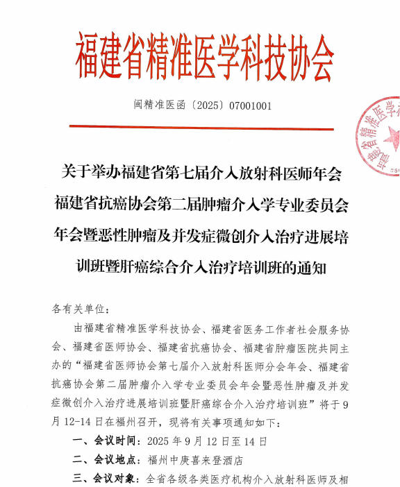 关于举办福建省第七届介入放射科医师年会福建省抗癌协会第二届肿瘤介入学专业委员会年会暨恶性肿瘤及并发症微创介入治疗进展培训班暨肝癌综合介入治疗培训班的通知
